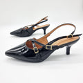 - Patent leather-look upper- Black hue- Pointy toe- Adjustable ankle strap- Extra comfort padded foot-bed- 5.5cm kitten heel- Extra comfort rubber sole- Memory foam-lined interiorMade in Brazil