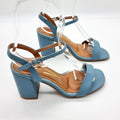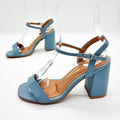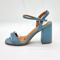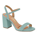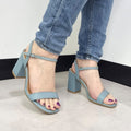 - Matte leather-look finish- Turquoise hue- Open toe- Adjustable ankle strap- Open heel counter- 8.5cm covered block heel- Non-slip rubber sole- Cushioned inner sole
